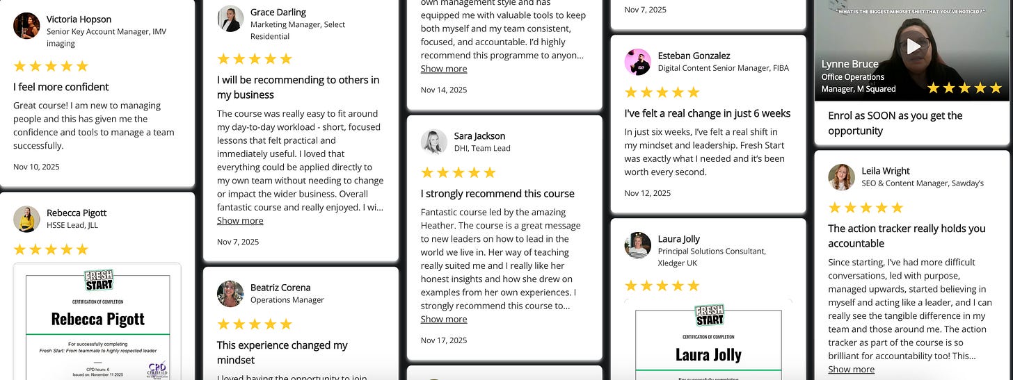 P.S. Fresh Start is even more powerful when you enrol a group of managers. You get faster behaviour change, shared language across the team, and far less time lost to misalignment and rework. I also run private Q&As to tackle real, live challenges. If you have 5+ managers who need to level up together, you can book a no-pressure consultation call here.